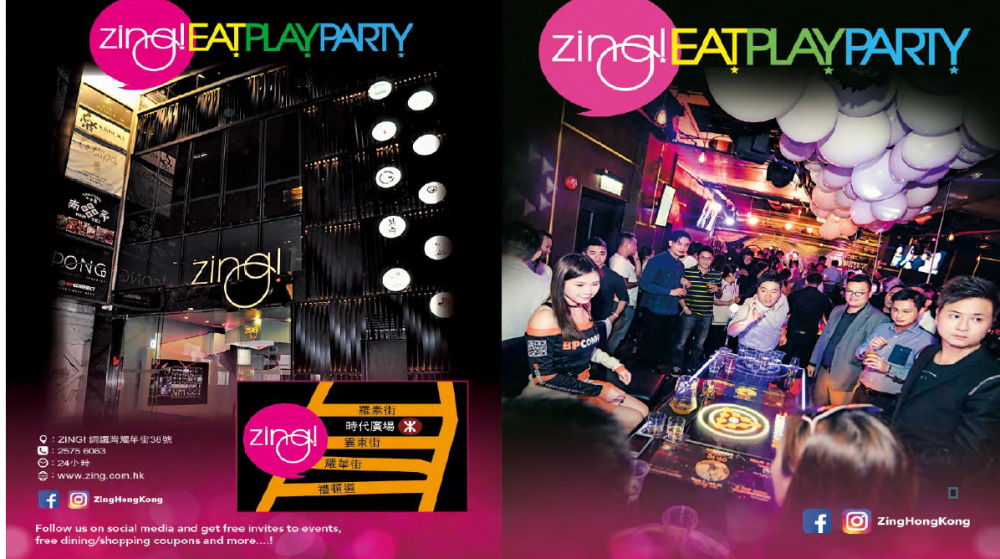 Located at 38 Yiu Wa Street, Causeway Bay, Hong Kong, ZING! is situated in the prime location of Causeway Bay, a major area for shopping and entertainment, busy all day and all night. The building was completed in 2011 and was extensively refurbished in 2015, becoming a 30-storey Ginza-style commercial building. The total area of the building is about 79,051 square feet, with tenants widely spread across extensive portfolio of entertainment, catering and leisure industries. The high-rise merchants delight in a 270-degree panoramic and breathtaking views of the Victoria Harbor as well as the Happy Valley Racecourse whilst providing ultimate customer experience. Customers can find shisha bar originated from California, Molecular Mixology BAR, Michelin-recommended Japanese cuisine as well as Japanese-French fusion fine dining restaurant in ZING!.