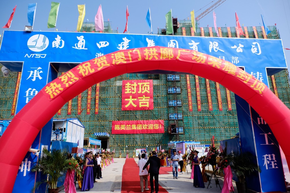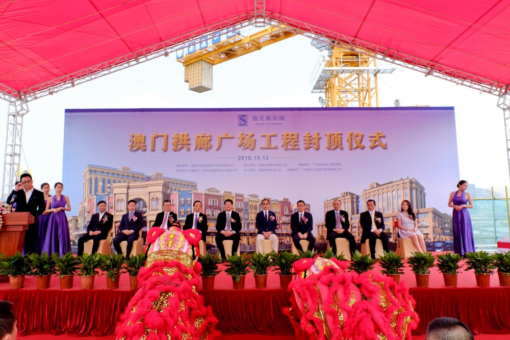 Yu Xiangjun, Vice Minister of the Coordination Department of Liaison Office of Central People's Government in Macau, Liu Yiliang, Representative of the National People's Congress of Macau District, Vong Vai Lon Agostinho, member of Executive Committee of Macau Trade and Investment Promotion Institute, Luo Zengqing, Deputy Director of the Hengqin New District Management Committee, Chan Hio Peng and Cai Chunyan, Deputy General Managers of Bank of China Limited Macau Branch, Lucas Lo, Chairman of Similan Macau and Maximiliano Lo, Deputy Chairman and CEO of Similan Macau, attended the topping out ceremony of the MACAU ARCADE PLAZA on October 12, 2018.